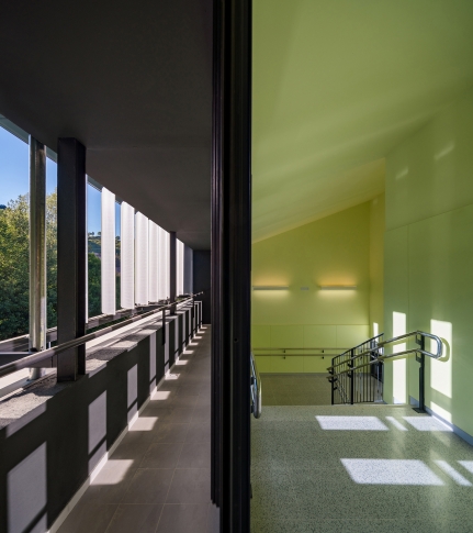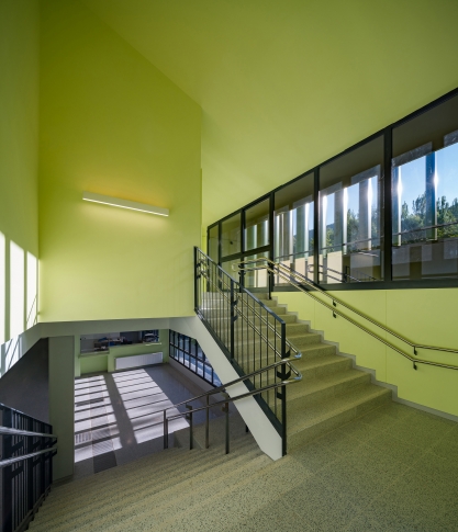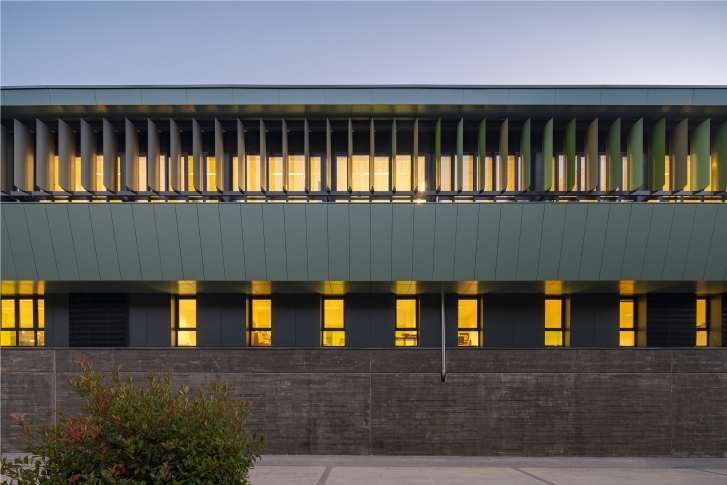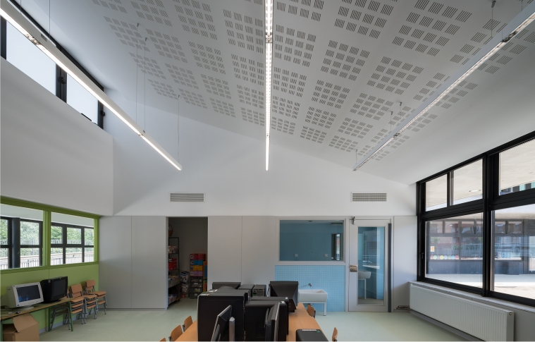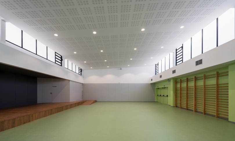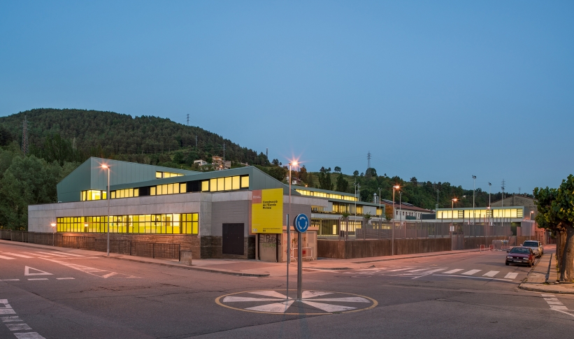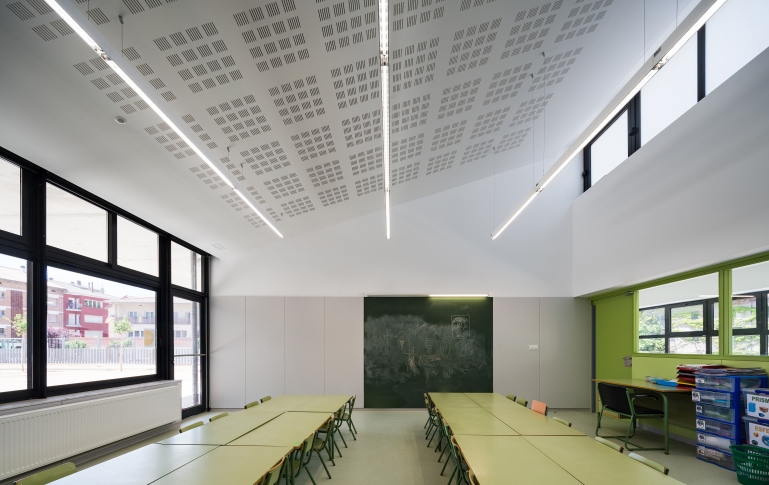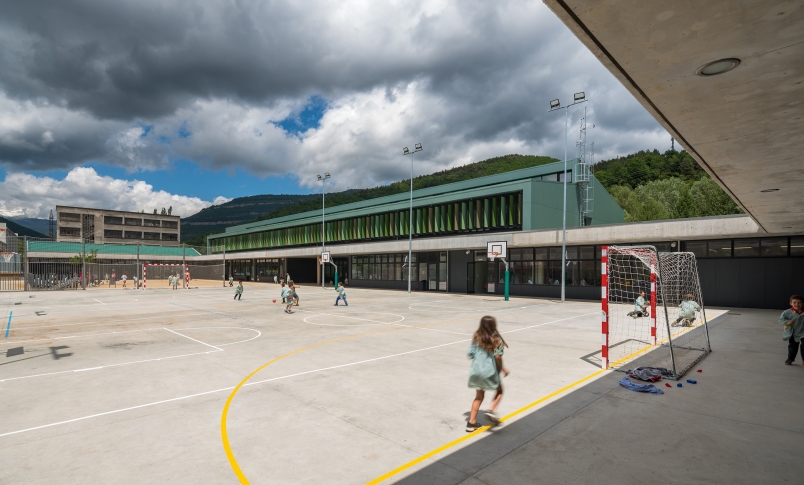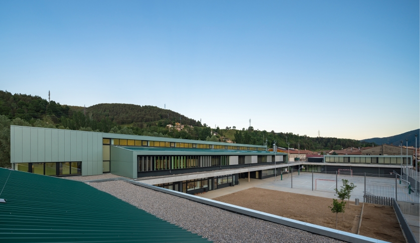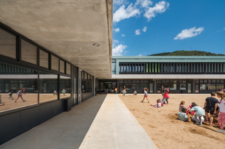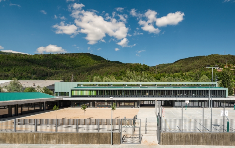 La planta presenta una figura en “U” que es situa sobre l’alineació al riu i s'obre al costat oest, relacionant els accessos i el pati amb el poble. Aquesta disposició permet segregar les àrees principals del Centre. Així, la volumetria longitudinal paral·lela al riu, conté a dos nivells la major part dels espais docents amb orientacions est i oest. A planta primera, integrades al disseny de les fusteries exteriors, totes les aules incorporen lames verticals orientables microperforades, que proporcionen acondicionament lumínic, millora tèrmica i aïllament acústic enfront el soroll aeri provinent d'una industria molt propera. El gimnàs, vestidors i serveis de pati, s'ubiquen al costat sud i un tercer volum, ubicat al costat nord, complementa els espais docents d'educació infantil. Totes les dependències de planta baixa queden connectades per un porxo perimetral de transició amb el pati i les pistes esportives.